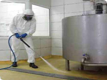 La potencia del agua de alta presión aplicada directamente mejora la eficiencia de la limpieza de muchas maneras. Las boquillas, las barras rociadoras y los brazos rociadores giratorios dirigen el flujo concentrado produciendo una agitación que elimina el material afectado de tambores, contenedores, bandas, transportadoras, pisos, paredes y otras superficies. Con la potencia de los sistemas de alta presión, se requieren menos pases de limpieza, lo que reduce considerablemente el tiempo y el trabajo de limpieza y reduce el consumo de agua.